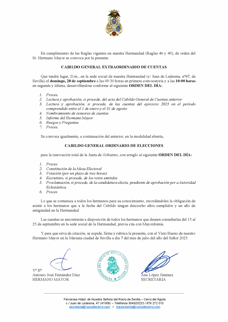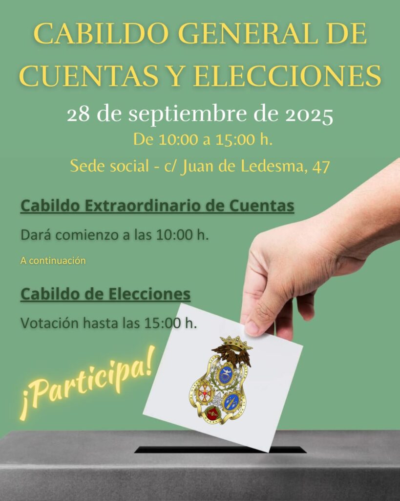 Recordamos a nuestros hermanos la importante cita del próximo domingo, 28 de septiembre, para el futuro inmediato de nuestra Hermandad. A las 10:00 h. dará comienzo el Cabildo General Extraordinario de Cuentas y a continuación se celebrará el Cabildo General de Elecciones, donde se elegirá a la nueva Junta de Gobierno. La votación durará al menos hasta las 15:00 horas.