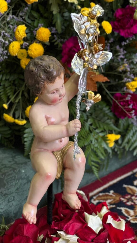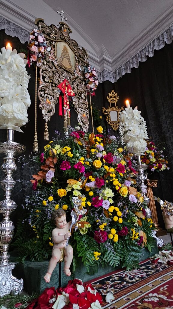 El altar ha lucido un exorno floral de especial delicadeza, donde se han entrelazado rosas en suaves tonalidades, margaritas y margaritas botón que han aportado frescura, claveles tradicionales, varas de liatris que han elevado la composición, liciantum y limonium que han aportado textura, junto al verde frondoso del eucalipto, la haya y el helecho que envolvieron la escena con naturalidad y elegancia.