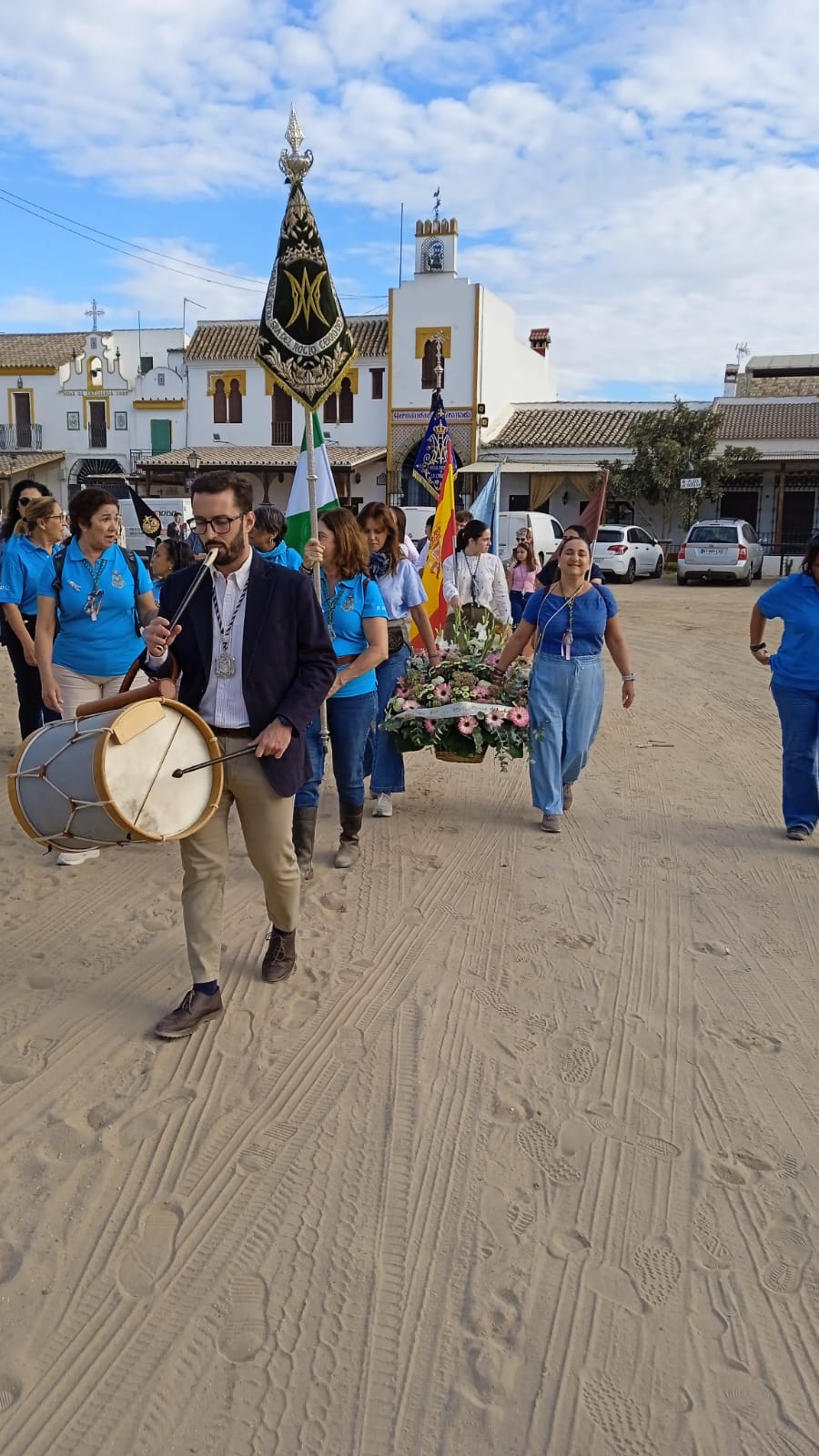 Durante todo el sábado recorrieron la Raya Real, con tiempo para rezar el Ángelus a mediodía, almorzar durante el camino y llegar al Puente del Ajolí donde coincidimos con la Peregrinación andando de nuestra madrina, la querida Hermandad del Rocío de Villamanrique Una vez en la aldea, lo primero fue visitar a nuestra Madre, la Virgen del Rocío en su Santuario, y dirigirnos a la casa de la Hermandad del Rocío de Villanueva del Ariscal en la que pasamos la noche.